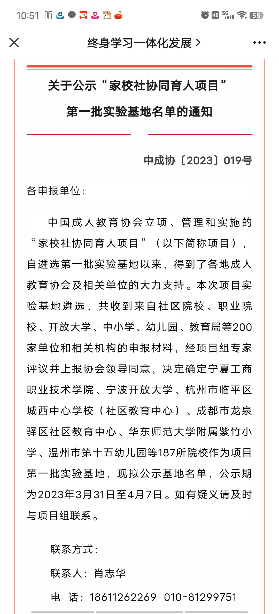 近日,中國成人教育協會發布了《關于公示“家校社協同育人項目”第一批實驗基地名單的通知》(中成協〔2023〕019號),公布了“家校社協同育人項目”第一批實驗基地名單,德清縣社區教育學院成功入選。