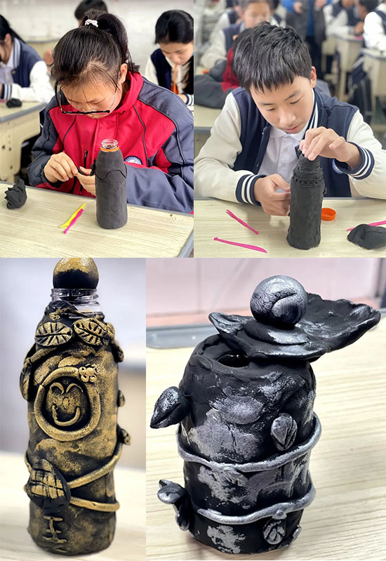 制作過程中,同學們情緒激昂,相互討論、相互構思,個個大顯身手,每一件作品都充滿著豐富的想象力和創造力。同學們在快樂的課堂制作中不僅感受到手工的樂趣,強化了廢舊物品循環再利用的創意理念,更體會到綠色環保的重要性。