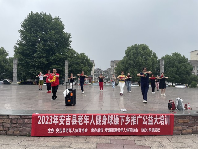 6月8日上午,由安吉縣社區教育學院孝源學習中心和孝源街道老年人體育協會、鄉村藝校(國學)分校共同舉辦的老年人健身球操下鄉推廣公益大培訓活動在孝源村文化禮堂廣場開展。來自該街道的32名健身球操老年愛好者參加培訓。