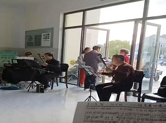 《何文秀.心連心》是第一次排練的曲目。“輕舟越過千里路,岸上風光美如圖。望長空雙雙燕兒沖霄過,他也是夫唱婦隨奔前途。看池塘魚兒對對戲碧波,他也是情投意合永相和……”遠遠地就聽見傳來陣陣樂器聲和美妙的歌聲,走近看,三位女團員手拿話筒聲情并茂地演唱著“心連心”橋段,周圍是其他團員正在演奏樂器。有二胡、琵琶、電子琴等等。表演節目時大家都非常認真,也都很開心。曹小芳表示,退休后的時間充裕,有更多的時間發展自己年輕時的愛好,和這么多志同道合的人一起搞活動很好、很開心。