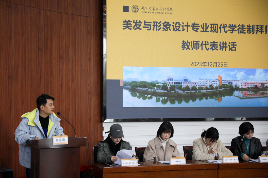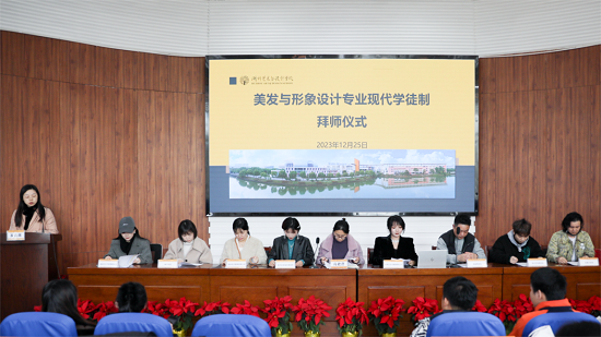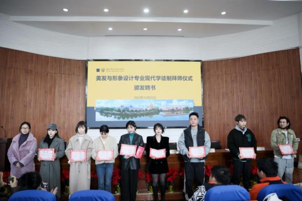 為進一步推動浙江省湖州藝術與設計學校美發與形象設計專業現代學徒制項目建設,2023年12月25日,美發與形象設計專業2218班現代學徒制跟崗實習拜師儀式在學校報告廳舉行。吳興新煌子美發工作室、蔡子文化傳播有限公司、湖州告白婚紗有限公司、吳興錦泉理發店、艾佳理發店、維予造型、楓敘文化傳播公司、花笙紀美容院等8家合作企業的負責人,以及學校領導、教師和學生等參加儀式。