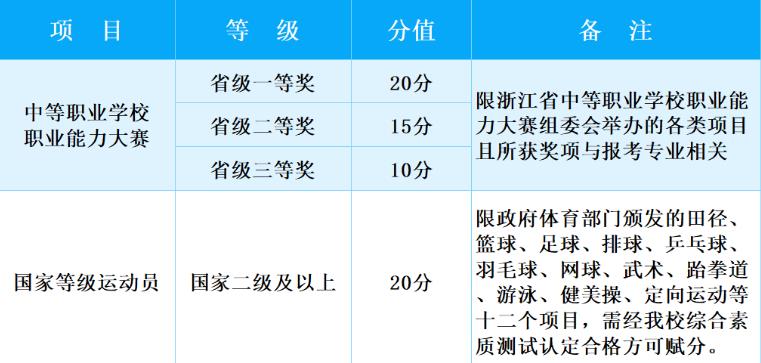以上賦分為個(gè)人項(xiàng)目,其他所有團(tuán)體項(xiàng)目成員按個(gè)人項(xiàng)目分值的50%計(jì)分。考生不同類獎(jiǎng)項(xiàng)可累計(jì)賦分,但賦分最高分值累計(jì)不超過(guò)20分。素質(zhì)特長(zhǎng)項(xiàng)目賦分需經(jīng)相關(guān)部門(mén)認(rèn)定,學(xué)校招生領(lǐng)導(dǎo)小組審核后有效。