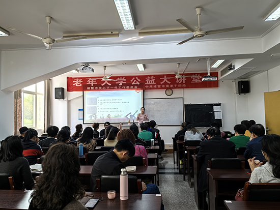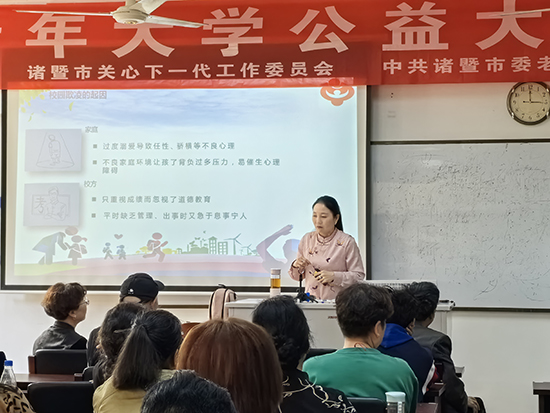 4月10日下午,諸暨市老年大學邀請諸暨市關工委幫扶團副團長蔡美為老年學員舉行“預防校園欺凌”講座,近百人聽課。
