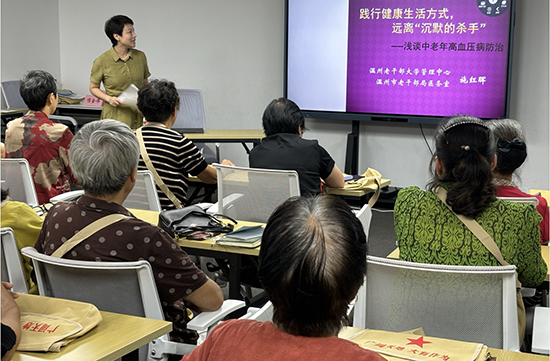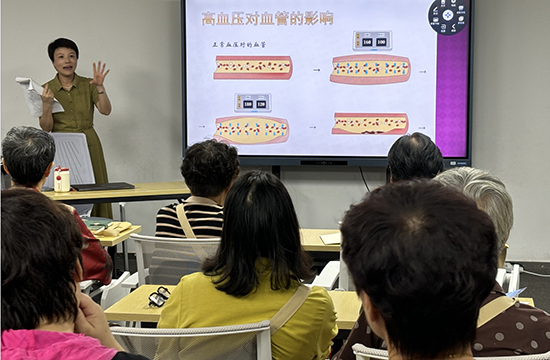 開班儀式結(jié)束后,三十多位中老年學(xué)員共同聆聽了施醫(yī)生關(guān)于《踐行健康生活方式,遠(yuǎn)離沉默的殺手——淺談中老年高血壓病防治》專題講座。講座長達(dá)兩小時(shí),施醫(yī)生就重視高血壓、了解高血壓、高血壓的治療和健康生活方式、如何家庭自測血壓、血壓波動(dòng)時(shí)的自我管理五大方面,作了耐心細(xì)致、深入淺出的講解,深受中老年學(xué)員歡迎。