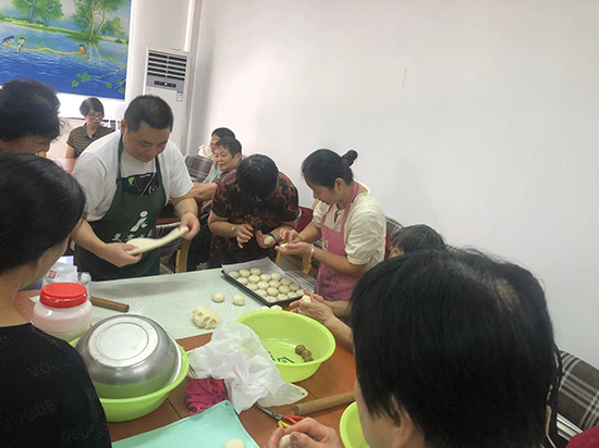 在老年學(xué)堂,高級面點(diǎn)師王麗華老師精心準(zhǔn)備了面團(tuán)、餡料、手套、木餅印等材料和工具,并詳細(xì)介紹手工月餅的制作過程和動(dòng)作要領(lǐng)。老人們按照老師講解的步驟:揉面團(tuán)、包餡、放模具內(nèi)按壓成型,每一道程序都忙得不亦樂乎。大家一邊做月餅,一邊嘮家常,歡笑聲不斷。很快一個(gè)個(gè)精美可口的蘇式月餅就做好了。