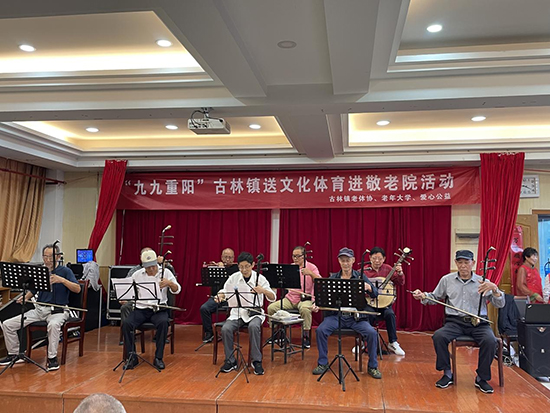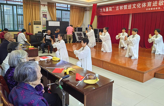 活動(dòng)開始時(shí),古林鎮(zhèn)老年大學(xué)太極拳班的學(xué)員們?yōu)槔先藗冋故玖死夏?6式楊式太極拳、觀音拳、功夫扇和木蘭扇等健身節(jié)目,并現(xiàn)場(chǎng)示范了一些簡(jiǎn)單的伸展動(dòng)作,如頸部伸展、肩部旋轉(zhuǎn)、手臂拉伸等。老人們認(rèn)真跟著一起做動(dòng)作,在溫暖親切的互動(dòng)中,一起體驗(yàn)運(yùn)動(dòng)的樂趣。接著,二胡班的學(xué)員們?yōu)槔先藗儷I(xiàn)上了歌曲《十五的月亮》,他們的演奏技巧嫻熟,音色悠揚(yáng),讓老人們陶醉在音樂的海洋中。此外越劇班、甬劇班的學(xué)員們帶來了經(jīng)典戲曲選段,他們唱腔婉轉(zhuǎn),表演細(xì)膩。聽著熟悉的旋律,老人們興奮地一起揮舞著手中的小國(guó)旗,開心地跟著哼起了小調(diào)。