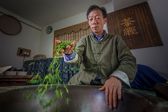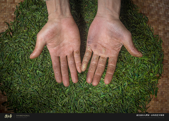 樊生華活到老,學到老。14歲學炒茶,20歲正式“出道”的他與西湖龍井打了一輩子交道。西湖龍井以色綠、香郁、味甘、形美“四絕”聞名天下。嫩綠光潤的龍井茶葉倒進光亮的鐵鍋,一雙長有老繭的手熟練地在200多度高溫的鍋中輕重有度地揉搓著,手腕輕輕抖動,抖、搭、搨、捺,茶葉在手掌心翻轉、跳躍。不一會兒,清新的龍井茶香就彌漫開來。
