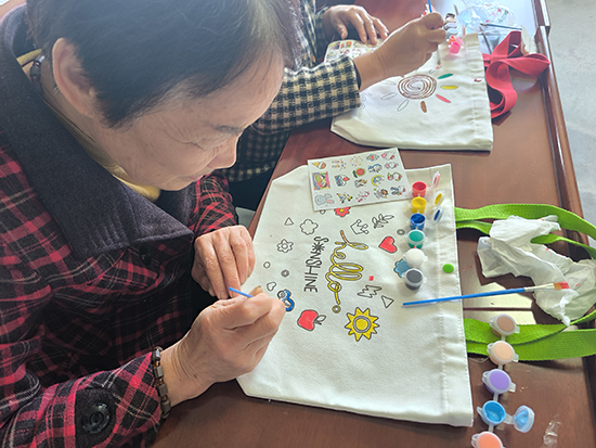 老人們挑選了各自心儀顏色的畫筆,輕輕地在帆布包上涂抹,隨著顏料的層層疊加,各種圖案逐漸變得鮮活起來。有的老人在涂色時小心翼翼,力求完美;有的則大膽揮灑,享受著創(chuàng)作的樂趣。一位老人分享了他的感受:“在涂色的過程中,能感覺到心靜下來了,這些顏色搭配也是我自己挑的,蠻好,心情也變得舒暢了。”