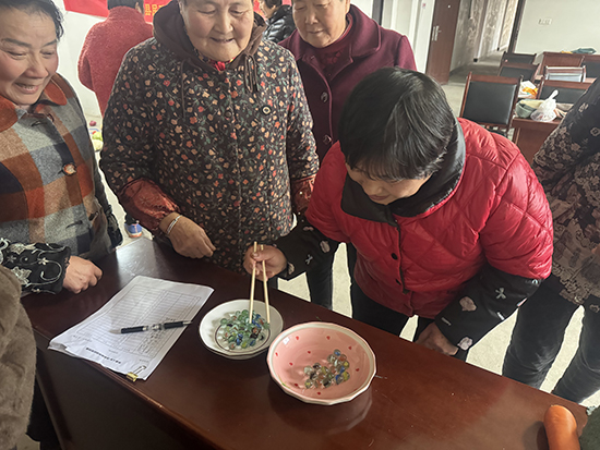 “夾彈珠挑戰(zhàn)手眼協(xié)調(diào)”, 另一邊的夾彈珠活動也在緊張而歡樂地進(jìn)行著。桌上擺放著裝滿彈珠的盤子和筷子,老人們需要用筷子將彈珠從一個盤子夾到另一個盤子里。這看似簡單的動作,其實(shí)需要很好的手眼協(xié)調(diào)能力。老人們?nèi)褙炞ⅲ械睦先耸址ㄊ炀殻焖俚貖A起一顆顆彈珠;而有的老人雖然動作稍慢,但也十分認(rèn)真,周圍的人也會為他們加油鼓勁。每成功夾起一顆彈珠,老人們都會收獲滿滿的成就感。