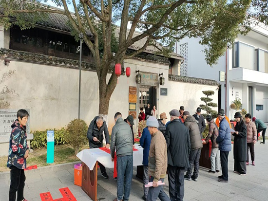 為了營造祥和喜慶、文明有禮的新春佳節(jié)氛圍,安吉縣社區(qū)教育學(xué)院天子湖分院鄣吳老年學(xué)校書法長班學(xué)員們在雷學(xué)鋒老師的帶領(lǐng)下于1月14日上午在昌碩故居前寫春聯(lián)、寫福,提前為社區(qū)居民們送上蛇年春節(jié)的祝福。