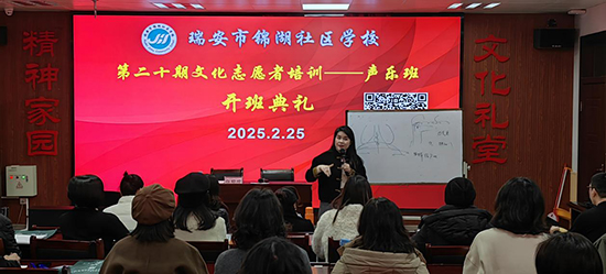 2月25日晚,瑞安市錦湖社區學校的文化禮堂燈火通明,迎來了第二十期文化志愿者聲樂班培訓的開班典禮。此次活動吸引了40多位熱心文化事業的學員參與,旨在通過聲樂培訓助力鄉村文化振興。