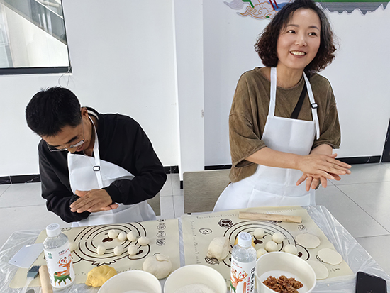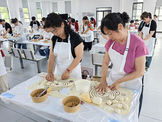 培訓(xùn)現(xiàn)場,專業(yè)面點師陳彬、魏國民為老年學(xué)員們詳細講解了中式面點制作的技巧與方法,從面團的揉制、發(fā)酵,到餡料的調(diào)配,再到造型與烘焙,每一個步驟都耐心指導(dǎo)。學(xué)員們圍在桌前,認真聆聽,不時提出疑問,隨后便迫不及待地動手實踐。大家系著圍裙,專注地揉面、包餡、塑形,互相交流經(jīng)驗,歡聲笑語回蕩在教室中。兩位師傅剛不停地在人群中穿梭指導(dǎo)。