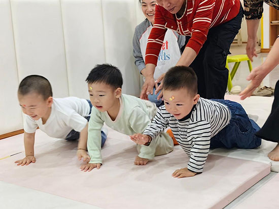 最具挑戰性的“爬爬拿玩偶”體能環節,教師團隊巧妙設置彎道、障礙物等趣味賽道,以毛絨玩具作為目標物激發爬行動力。當孩子們手腳并用地沖向終點時,教師實時蹲身引導:“膝蓋抬起來,加油往前爬!”家長們則在賽道兩側用掌聲助力,該環節不僅鍛煉了幼兒肢體協調性,更通過即時正向反饋增強了勇氣與自信。活動現場氛圍熱烈,寓教于樂的形式顯著提升了親子互動質量,贏得了家長們的一致點贊。