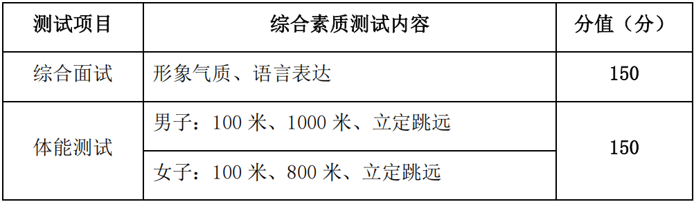 (一)綜合素質測試流程為先綜合面試,后體能測試。綜合面試、體能測試均設置合格分,達不到合格分的予以淘汰。