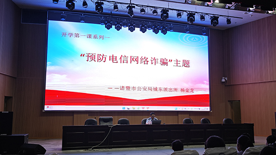 新學期伊始,為進一步增強學生的安全防范意識和法治觀念,諸暨市公安局城東派出所楊金龍警官作為諸暨技師學院法治副校長,為全體學生開展專題講座。講座圍繞“預防電信詐騙”和“普及法律常識”兩大主題展開,以鮮活的案例、詳實的講解,為同學們帶來了一場內容充實、警示深刻的法治教育課。