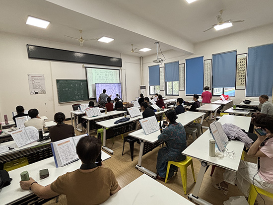 課堂上,吳商擔(dān)老師照例先帶領(lǐng)學(xué)員們復(fù)習(xí)鞏固上次課程所學(xué)的曲目與技巧。學(xué)員們手持電吹管,神情專注,在吳老師的悉心指導(dǎo)下,認(rèn)真練習(xí),力求每個(gè)音符都準(zhǔn)確無(wú)誤。悠揚(yáng)的旋律在教室中回蕩,展現(xiàn)了學(xué)員們積極向上的學(xué)習(xí)熱情和日漸精湛的演奏技藝。
