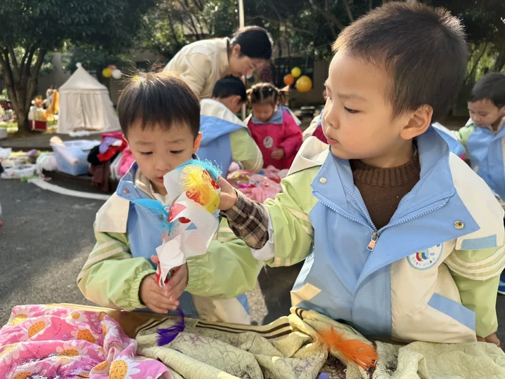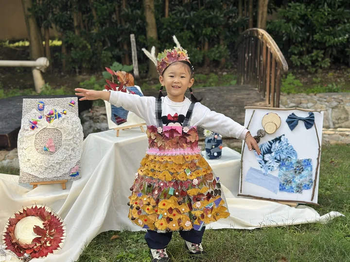 結合主題課程實踐,幼兒園組織幼兒走進園區自然環境,通過找一找、摘一摘、比一比等方式,運用多感官觀察秋天植物的形態特征。在“大樹冬日呵護行動”中,孩子們拿起毛線、絲帶為樹木編織“保暖新衣”,五顏六色的裝飾讓園區充滿童趣;“撿秋趣”活動里,幼兒親手制作布袋,收集落葉、枯枝等自然素材,拼貼成創意圖案,定格秋日美好;“衣舊精彩——創意改造大派對”上,幼兒與家長攜手變廢為寶,將舊衣物、閑置物品改造為特色服飾與趣味玩具,作品在幼兒園廣場集中展覽,吸引全園師幼駐足觀賞、家長拍照留念,讓環保理念與創新思維在實踐中生根發芽。