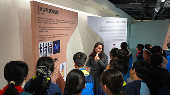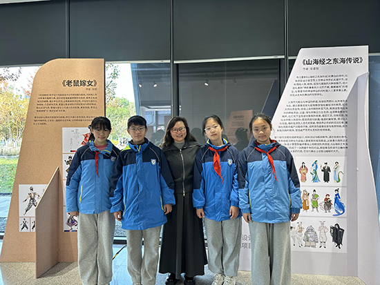 在上城區(qū)文化特派員張西琴的介紹下,孩子們的好奇心被徹底點(diǎn)燃。在《老鼠嫁女》展區(qū),大家圍著手稿追問(wèn)苗族刺繡的寓意;看到《琵琶行》的服飾配色變化,有同學(xué)主動(dòng)分享自己對(duì)詩(shī)句的理解。張西琴為孩子們搭建起通往專業(yè)藝術(shù)領(lǐng)域的橋梁,她結(jié)合展品細(xì)致拆解設(shè)計(jì)背后的文化內(nèi)涵與創(chuàng)作邏輯,讓孩子們讀懂蒙古族圖騰、唐代服飾形制如何與劇情深度融合,明白AI技術(shù)如何為傳統(tǒng)紋樣數(shù)字再生賦能。