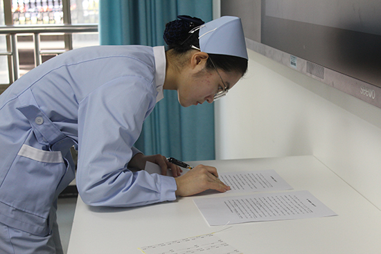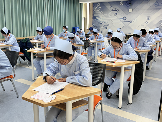 理論考場(chǎng)上,選手們沉著執(zhí)筆,憑借扎實(shí)基礎(chǔ)流暢作答,盡顯對(duì)護(hù)理知識(shí)的熟練掌握。