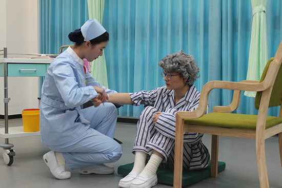 第二賽道里,選手們快速判斷老年患者傷勢(shì),包扎繃帶松緊適度,輪椅運(yùn)送時(shí)細(xì)心調(diào)坐姿、系安全帶,輕聲安慰讓“患者”倍感安心。