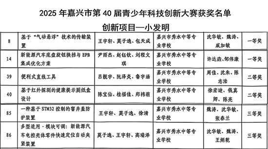 在“創新項目—小發明”類別中,學生表現尤為亮眼:由王宇軒、莫子逸、包天成同學設計,沈華敏、魏濤、戚加敏老師指導的《基于“氣動懸浮”技術的傳輸裝置》;由尹麗杰、趙鈺欽、劉程文琪同學完成,許達垚、鄒偉康老師指導的《新能源汽車底盤故障檢測與EPB集成優化方案》雙雙榮獲一等獎,體現了學校在精密工程與新能源汽車技術教學方面的扎實成效。此外,學校還在智能監測、裝備優化、安全防護等實用領域收獲二、三等獎,展現出學生跨學科知識整合與解決實際問題的創新能力。