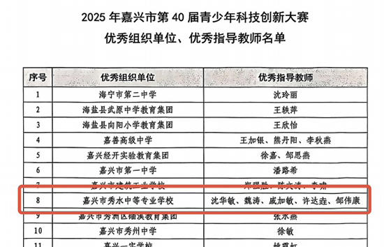 嘉興市秀水中等專業學校長期重視學生科技創新能力培養,持續構建“以賽促學、以創育人”的教育生態,通過開設科創選修課、建設創客實驗室、組建指導教師團隊等方式,為學生提供豐富的實踐平臺,近年來在各類省市級科技賽事中屢獲佳績,彰顯出在職業教育與科技創新融合方面的積極探索與豐碩成果。